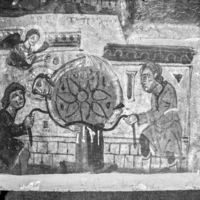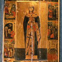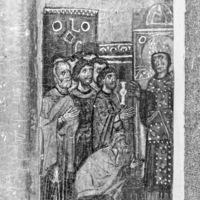 In Greek: "Saint"; "Catherine"; "saint in prayer"; "The saint [illegible]"; "The saint interrogated"; "The rhetors falling at the feet of the saint"; "The rhetors in the furnace"; (This and additional translations by P. Chaterjee, in the Getty catalogue).